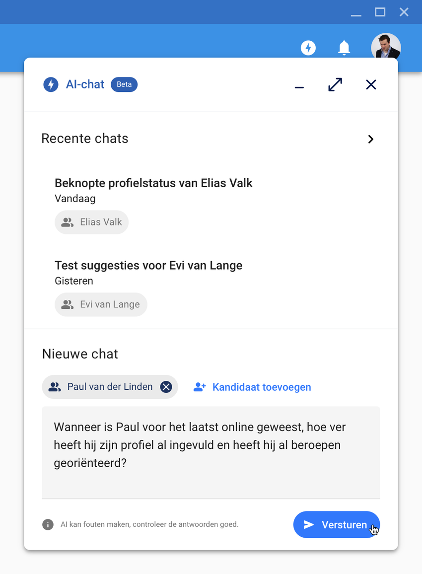 - Chat over je kandidaten en krijg inzicht in dossier-vraagstukken.