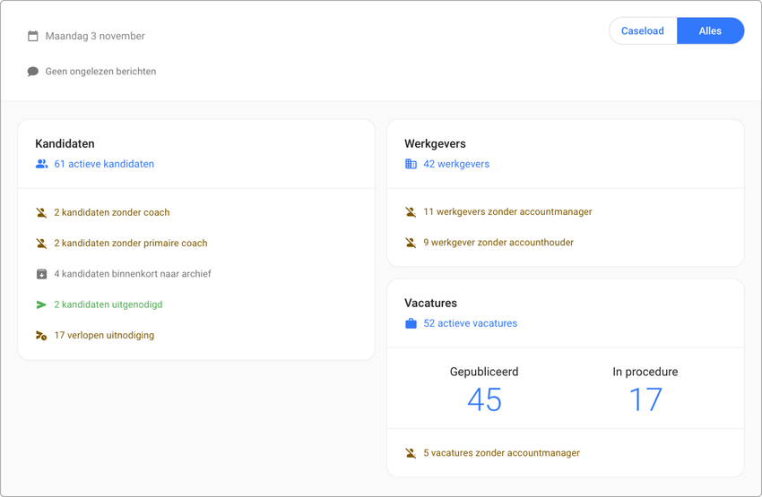 Coaches en accountmanagers kunnen nu de weergave van de homepage aanpassen om zo inzicht te krijgen in alle actieve kandidaten, werkgevers en vacatures binnen de volledige organisatie!