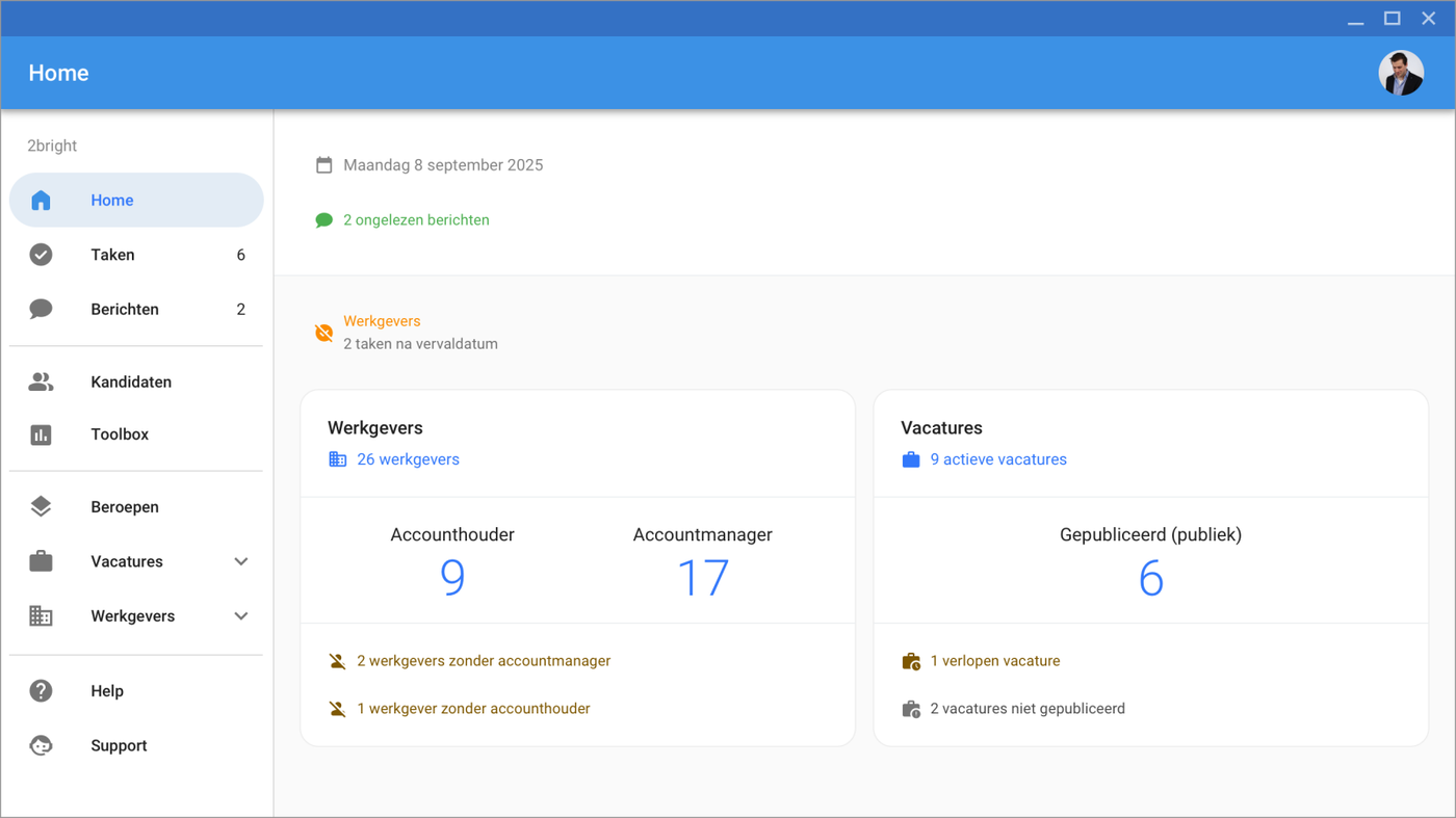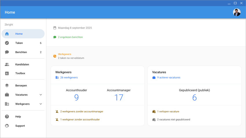 De homepage geeft o.a. inzicht in je openstaande taken, de werkgevers waar je accounthouder van bent en je actieve en gepubliceerde vacatures. Ook worden er handige meldingen getoond. Denk aan ongelezen berichten, openstaande taken na vervaldatum, werkgevers zonder accountmanager en verlopen vacatures.