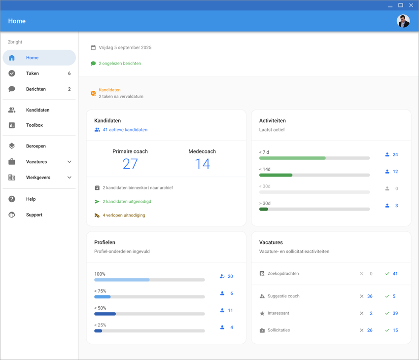 De homepage geeft inzicht in je caseload. Zo zie je in één oogopslag hoe actief je kandidaten zijn, hoe ver hun profiel is ingevuld en hoe de sollicitatie activiteiten gaan. Ook worden er handige meldingen getoond. Zo heb je snel inzicht in de kandidaten die binnenkort naar het archief gaan en hoeveel uitnodigingen er open staan en/of verlopen zijn. Maar ook je ongelezen berichten en openstaande taken na vervaldatum gerelateerd aan je kandidaten vind je hier terug!