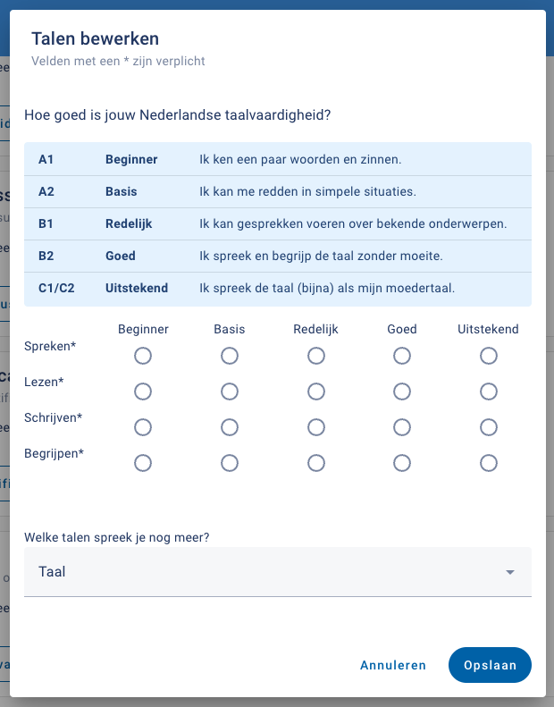 Om de taalvaardigheid van kandidaten nog nauwkeuriger in kaart te brengen, hebben we de omschrijvingen en niveaus bij de Nederlandse taalvaardigheid in het profiel vernieuwd.