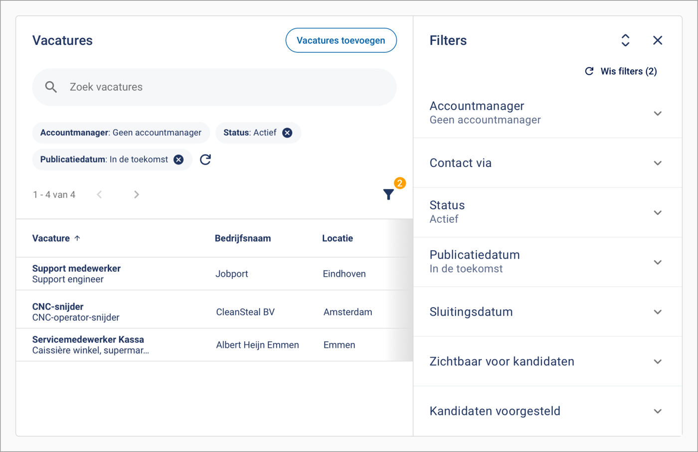 Het toevoegen van nieuwe vacatures gaat nu via de Vacature toevoegen knop in de rechterbovenhoek, en het filterpaneel open je nu via het filter-icoon (trechter) rechtsboven de tabel.